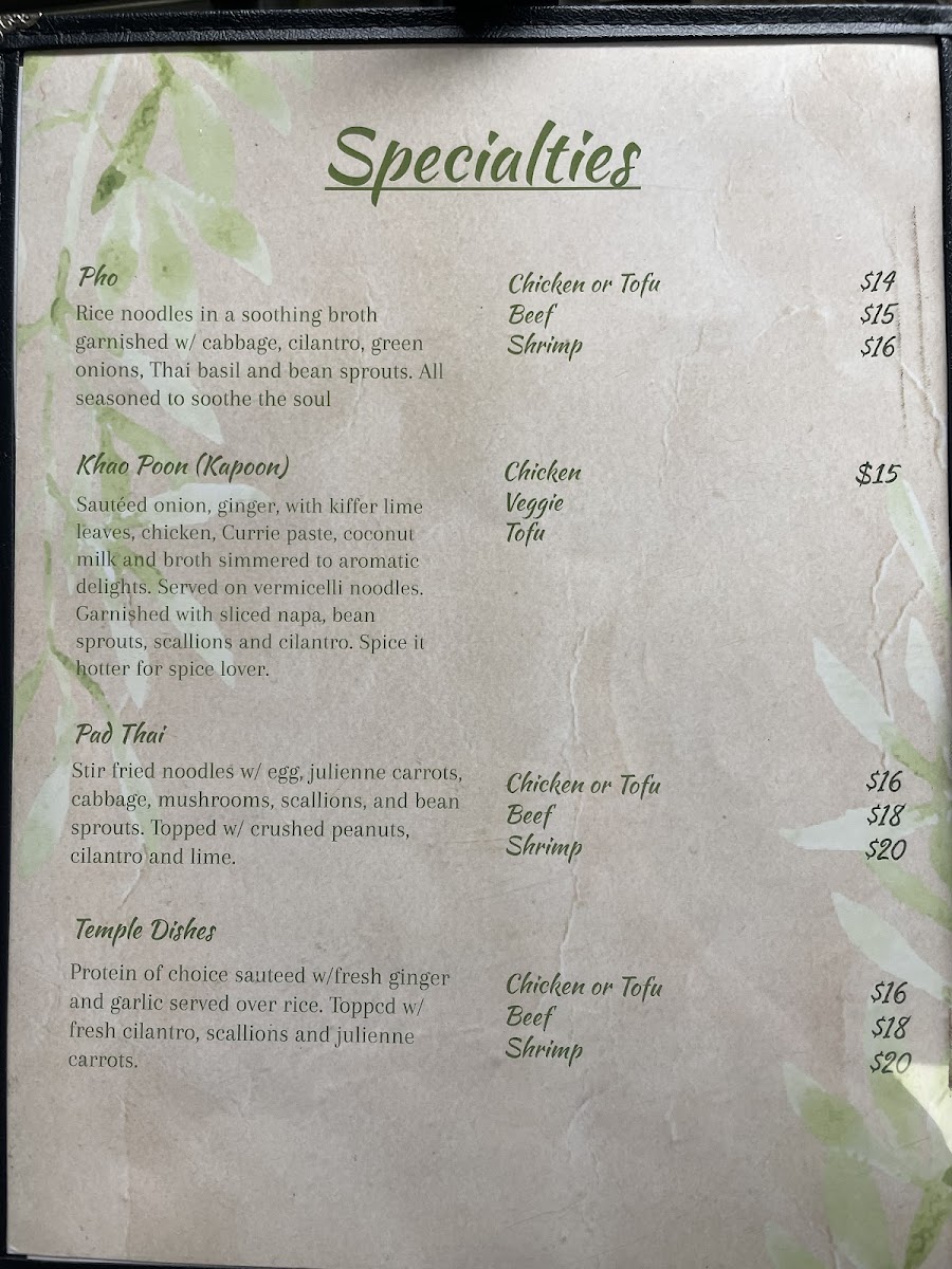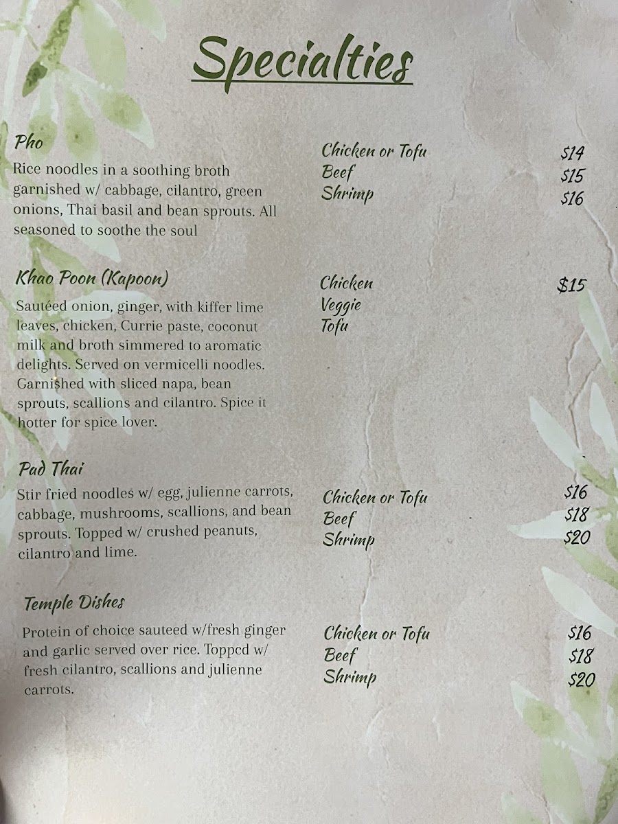 The menu includes comforting soups like Egg Drop and Coconut Curry Soup that provide warmth on cooler days, alongside vibrant dishes such as Orange Chicken and Curry Chicken that balance sweetness and spice with subtle depth. Fresh, herb-forward options like the Beef Spring Roll or Thai Noodle Salad with Tofu add a lighter, refreshing touch—perfect for when you want something both flavorful and satisfying without heaviness.